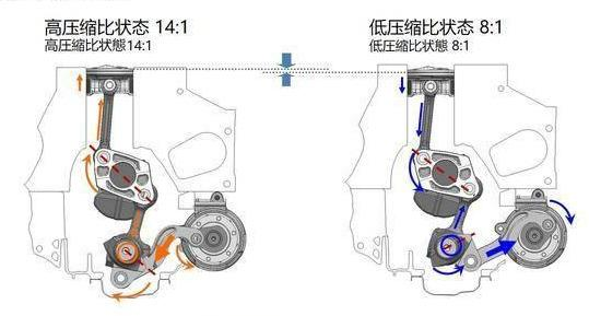就比如日产标志性的可变压缩比发动机,就可以通过非常精妙的结构来改变发动机活塞的运动轨迹,让气缸里面的汽油按照工况时而被压缩得紧一点,时而松一点,避免浪费。