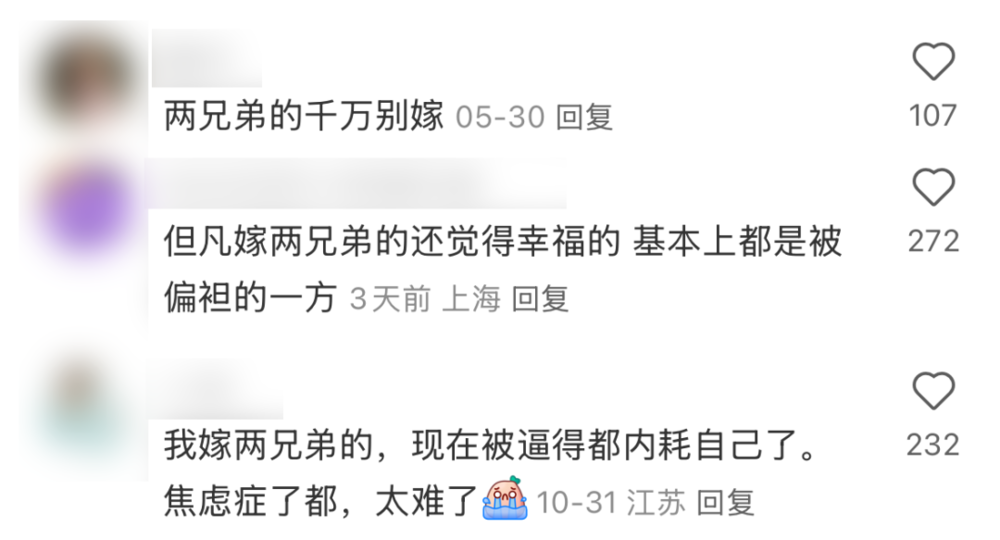 “养小猫小狗都会不自觉地偏心,更别提养孩子了。如果对方是家里被忽视的孩子,那你也会被连带着差别对待,还要拿来和其他儿媳、女婿比较。”