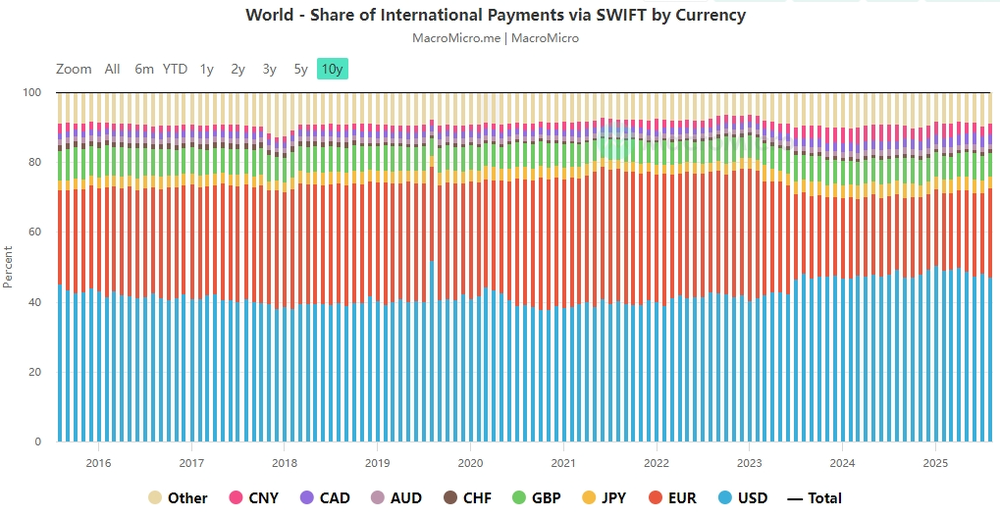在国际上,美国通过SWIFT渠道控制国际货币交易,最新美元份额约47%,表面上不错。人民币份额从2024年7月最高的4.74%跌至2025年8月的2.93%,“国际化”进展似乎不佳。但这是因为人民币主动与SWIFT部分脱钩,“不和美国玩了”,转而用自家的CIPS支持国际贸易与金融交易,2020年~2024年处理金额分别为45、80、97、123、175万亿人民币,2025年上半年90.19万亿元,同比增长约42%。