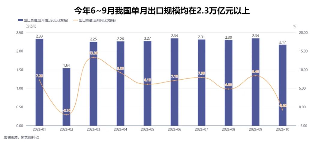 但从今年下半年整体情况看,6至9月份,我国单月出口规模均超过2.3万亿元,处于历史较高水平。9月出口同比增长8.4%,规模更是创同期历史新高。