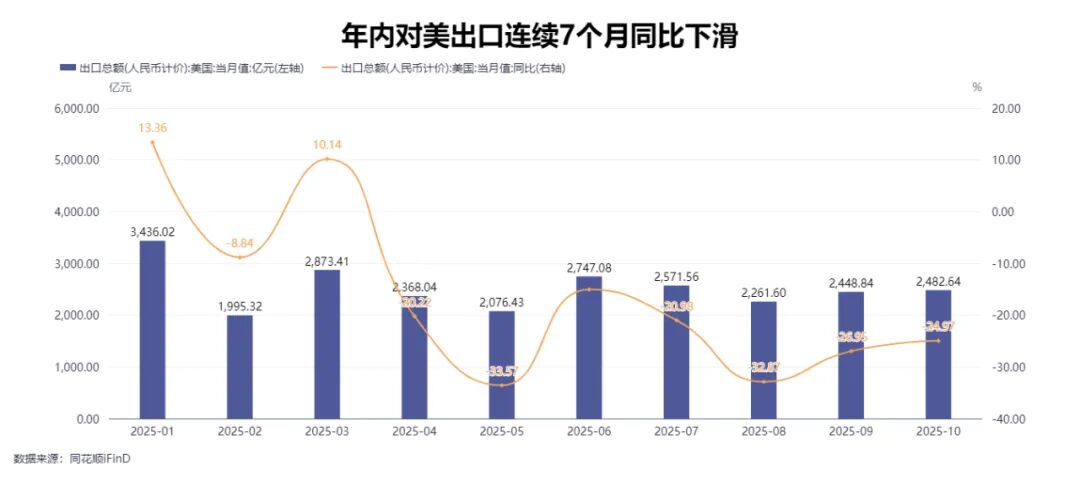 根据海关总署统计,今年前10个月,我国对美进出口总值3.38万亿元,同比下降15.9%,其中,对美出口2.52万亿元,同比下降17%,对美进口8511.8亿元,同比下降12%。从10月单月来看,对美出口2482.6亿元,同比下滑25%。
