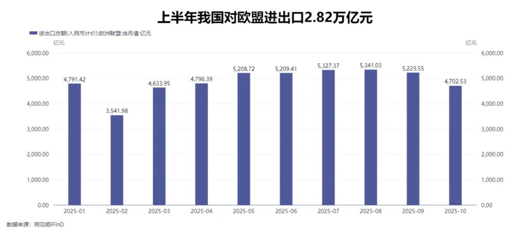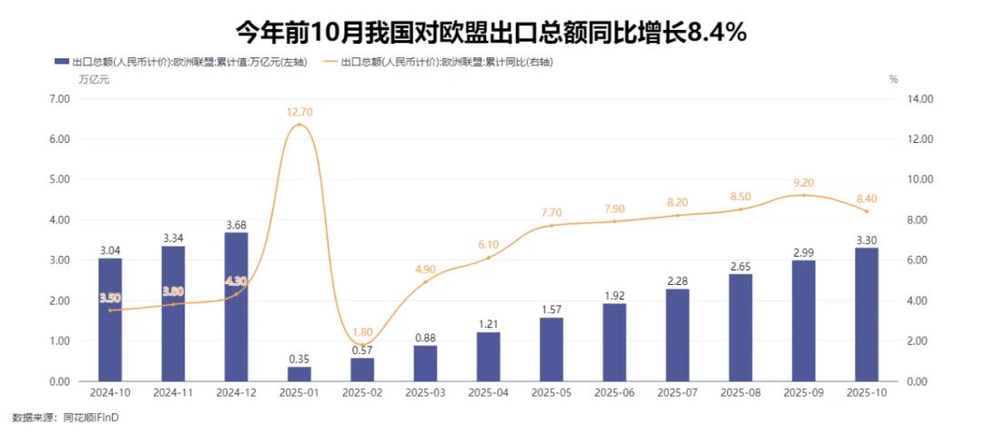 回望2024年同期,中国对欧盟出口规模约为3.04万亿元,同比增长3.5%。这意味着,今年前10个月我国对欧盟出口的增速大幅提升。