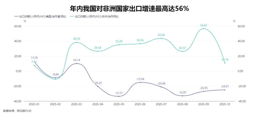 从单月出口情况来看,一方面,中国对美出口连续7个月出现两位数下滑。另一方面,中国对非出口连续8个月保持两位数正增长,多个单月出口增速超过30%。
