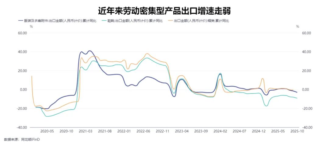 与此同时,以服装、鞋帽、塑料制品为代表的劳动密集型产品出口增速则整体走弱。前三季度,我国服装及衣着附件出口金额同比下降1.6%;鞋靴出口金额同比下降8.1%;出口帽类产品金额同比下降0.6%。