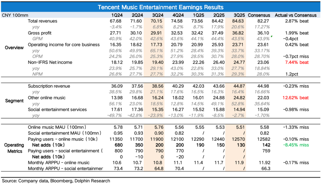 北京时间11月12日港股盘后、美股盘前,腾讯音乐(TME.N; 1698.HK)发布了2025年第三季度财报。整体看超预期,尤其是第二增长曲线的故事得以部分演绎。