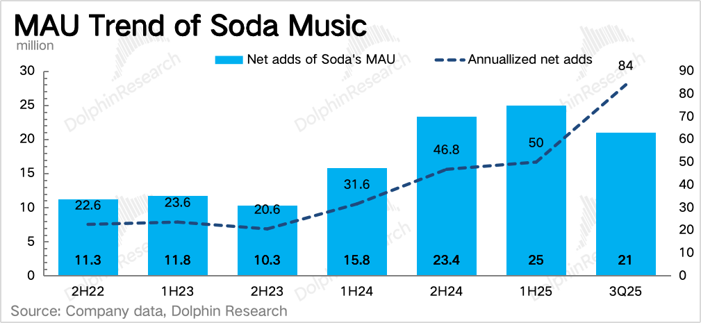 年初我们的假想是,如果净增数按照上述增长斜率(50%环比增长)不变,那么2025年H1有望净增7000万,意味着汽水音乐达成里程碑。因此如果汽水再进一步加大投入、抖音的导流,那么年底的规模甚至可能会超过龙二云音乐。