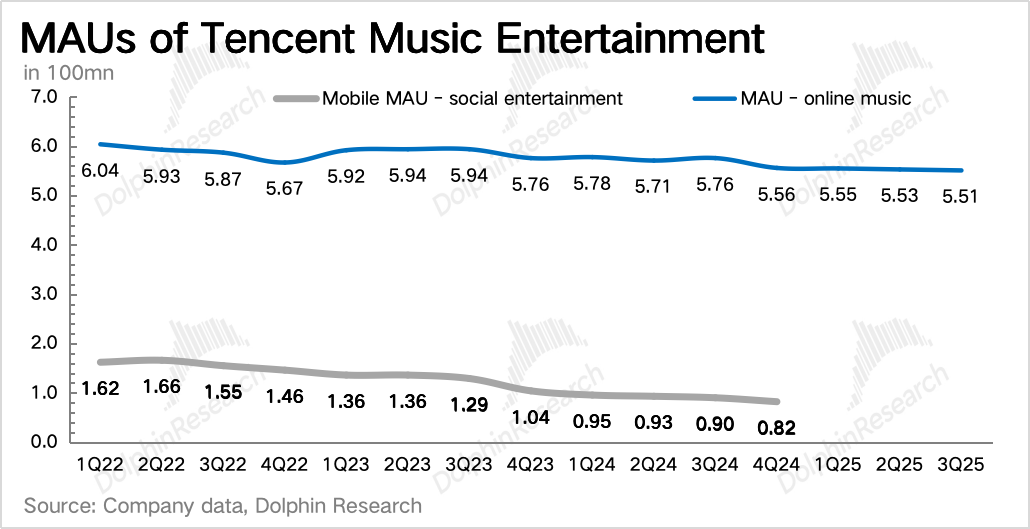 1. 行业成长性问题:当下并非重点。这是连带着消费降级衍生的老问题了,质疑的声音在2024年中到达顶峰,其中导火索就是腾讯音乐下调三、四季度的新增付费订阅数指引,净增人数从过去单季度300~500万(除Q1因为促销特殊净增达到680万),一下子掉进入100~200万区间。