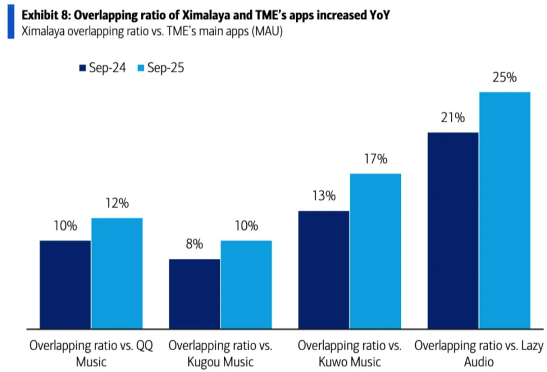 另一方面则是期待喜马拉雅合并后,带来的新增用户。毕竟两个平台核心用户重合度只有10%~15%,但音乐作为普适需求,若以捆绑包形式销售(比如现有会员搭售1~2元溢价),用户的付费转化并不难。