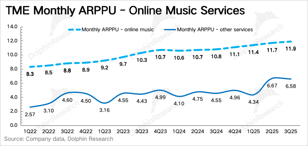 这部分包含广告、数字专辑销售、版权转授权、增值服务等,三季度主要得益于多个艺人的线下演唱会开展。这属于围绕粉丝价值变现的IP衍生周边业务,虽然受众规模要远小于音乐刚需受众,但单人价值量非常高,中国核心用户在这部分的消费力不亚于欧美。