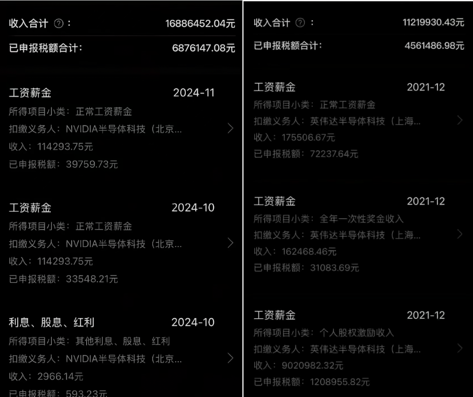 社交媒体上用户分享的疑似英伟达员工个税申报信息,仅供参考