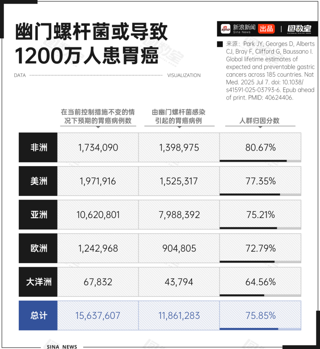 2025年7月,《Nature Medicine》发表的一项覆盖185个国家的研究指出,2008—2017 年出生人群中,预计有 1580万人可能在一生中某个时候患上胃癌,其中76%的病例与幽门螺杆菌感染有关。报告同时提到,全球1186万例胃癌可通过根除幽门螺杆菌预防,从区域来看,非洲的感染归因比例最高,达到80.7%。也就是说在非洲,如果能完全消除幽门螺杆菌感染,那么理论上可以减少超过80%的胃癌病例。亚洲地区的归因比例则为75.2%。