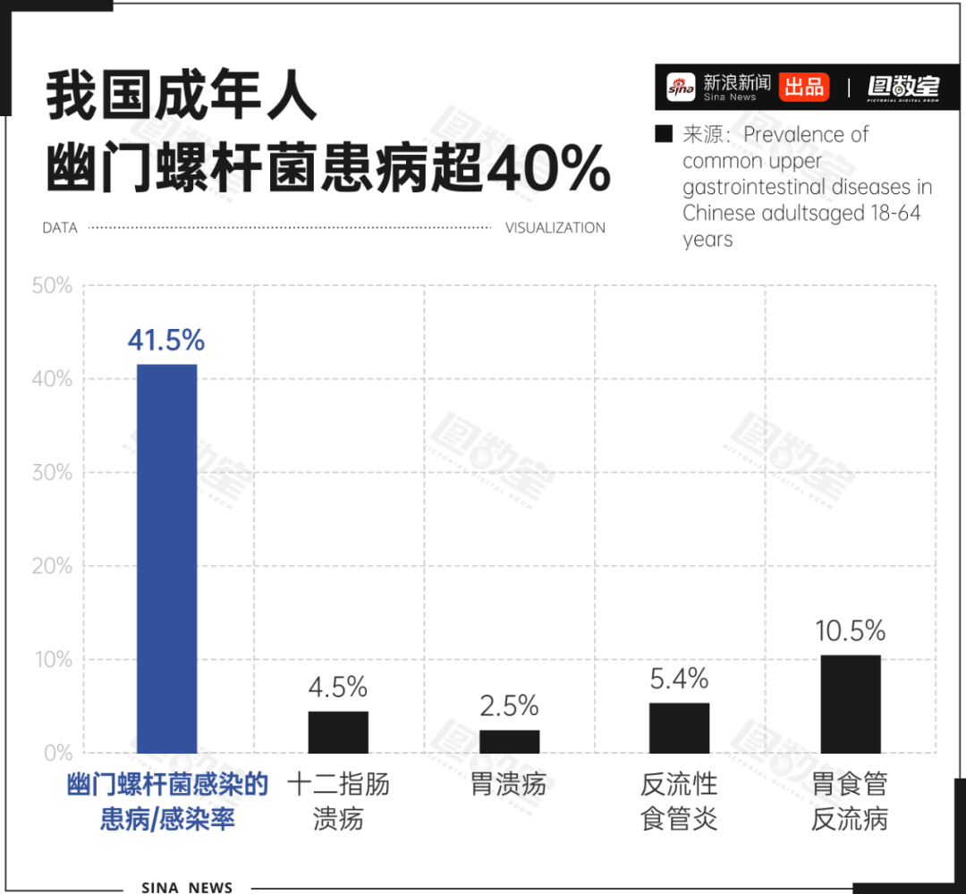 《科学通报》(Science Bulletin)上一项基于中国18至64岁人群常见消化道疾病患病率研究指出,我国成人居民的胃食管反流病及反流性食管炎患病率,以及幽门螺杆菌感染率均处于较高水平,18至64岁成年人中,幽门螺杆菌感染的患病/感染率高达41.5%,远高于胃食管反流病、反流性食管炎、胃溃疡、十二指肠溃疡等疾病。