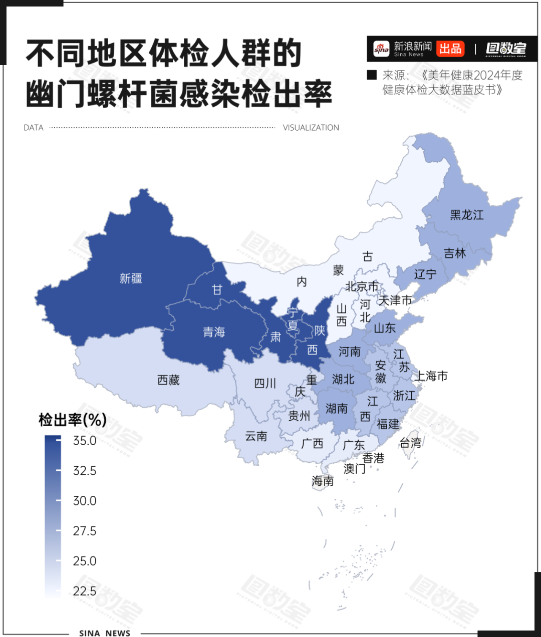 按地域看,西北地区的检出率最高,标化检出率为35.3%。华北和华南地区最低,标化检出率分别为22.3%和22.8%。