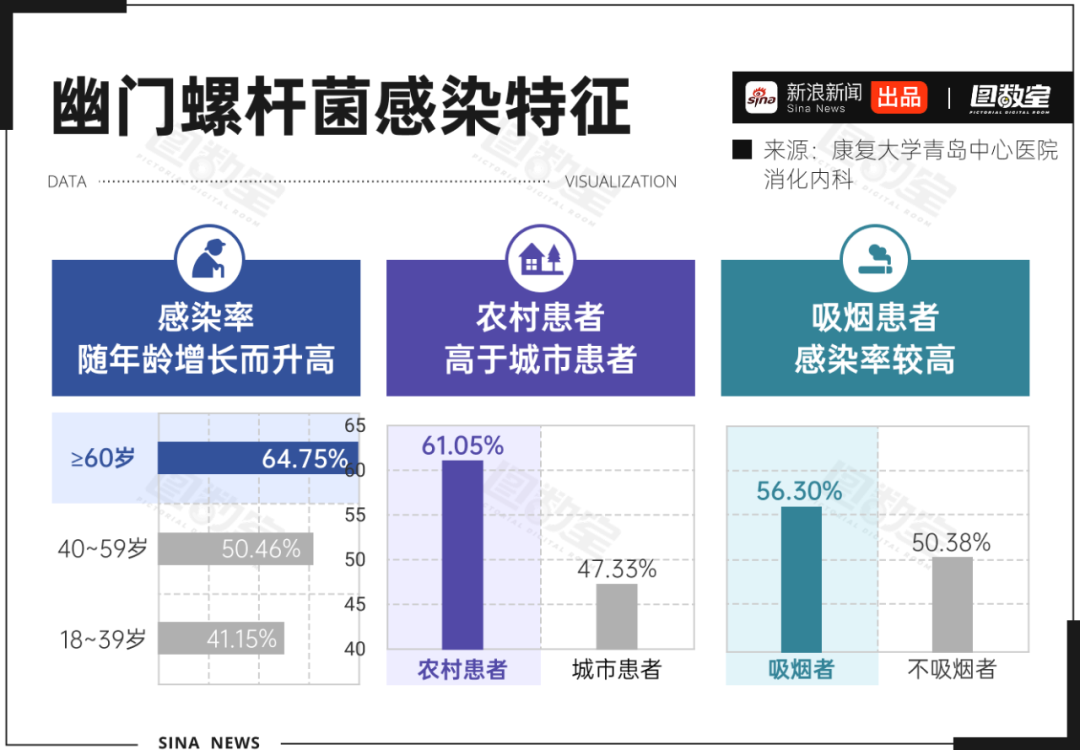 在中国,形势同样严峻。数据显示,18至64岁成年人中幽门螺杆菌感染率高达41.5%,相当于每10人中有超过4人感染,显著高于其他消化道疾病。感染呈现明显的地域和人群特征:西北地区检出率最高,农村感染率显著高于城市,且随着年龄增长,60岁以上人群感染率攀升至64.75%。数字背后,是共餐文化、卫生条件差异和公众认知不足共同作用的结果。