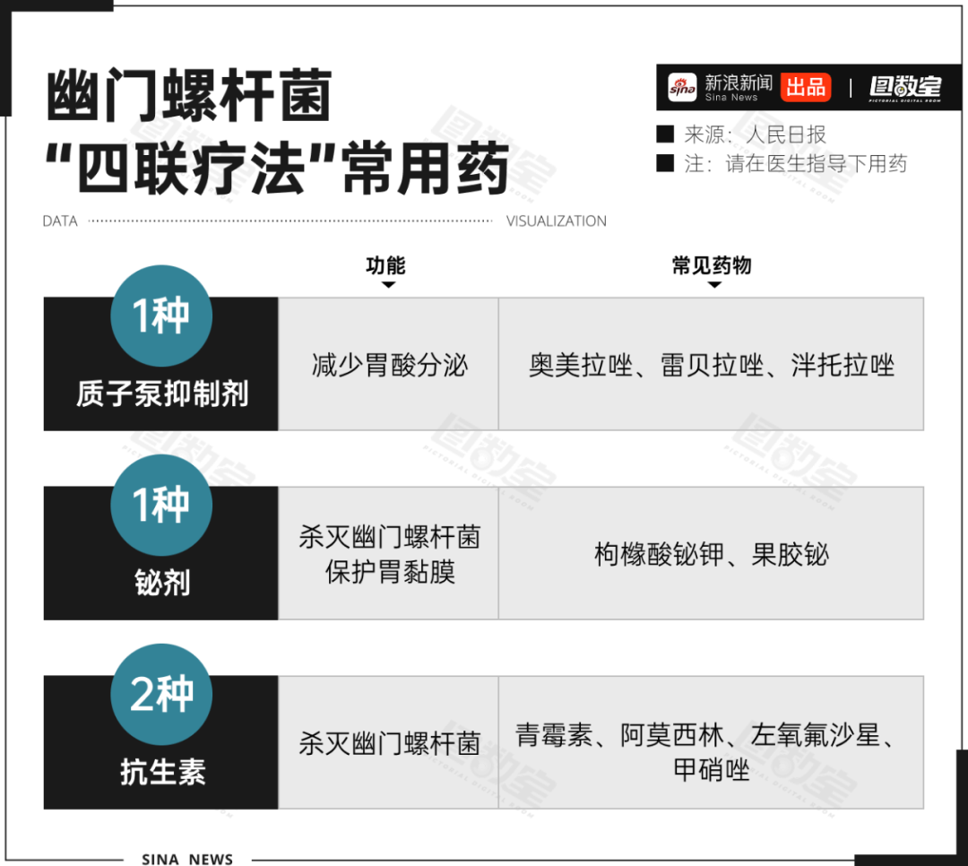 目前常用的“四联疗法”,得同时吃四种药:一种抑酸药、一种铋剂,还有两种抗生素。一天两次,一连吃10—14天,不能停。抑酸药可抑制胃酸分泌,让药效更好;铋剂既能保护胃黏膜,又有直接杀菌作用;抗生素则是用来杀灭细菌的,为什么要选择两种呢,是因为担心出现抗药的问题。