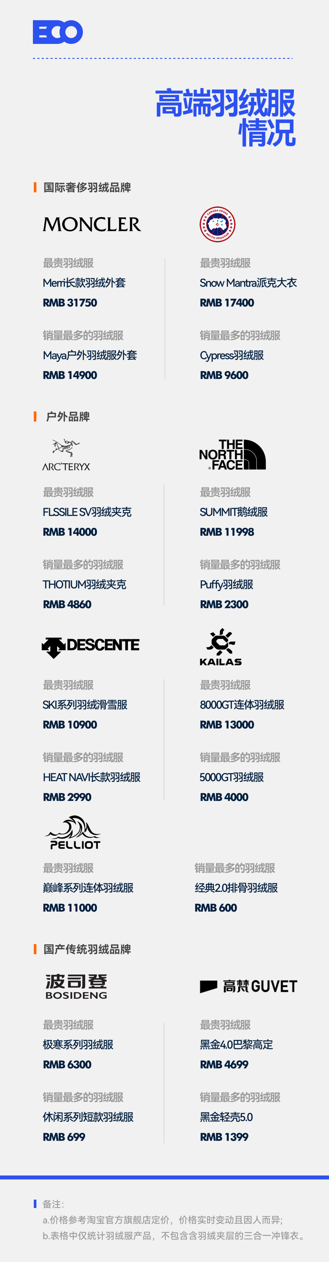 一是以加拿大鹅、Moncler为代表的国际奢侈羽绒品牌,价格基本上都在万元以上;