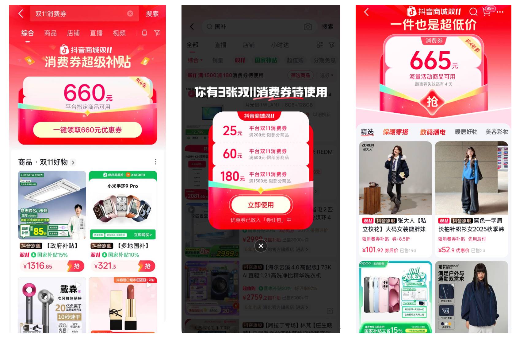 而在繁荣的内容生态之上,货架场承接的完善程度,直接决定了效率的最终落地。当前,抖音电商的货架场不仅是连接内容与消费的关键枢纽,更在用户高频互动中持续演进。过去一年,平台不断打通 “看内容 - 买商品” 的全链路:用户可在视频、直播、搜索、商城间无缝切换,无需跳转即可完成从 “被种草” 到 “下单” 的动作;双 11 期间,平台进一步推出 “商品卡免佣”“消费券补贴” 等政策,直接激励商家深耕货架场,最终推动双11当日货架销售额爆发 225%,印证了 “内容引流 + 货架承接” 的高效性。