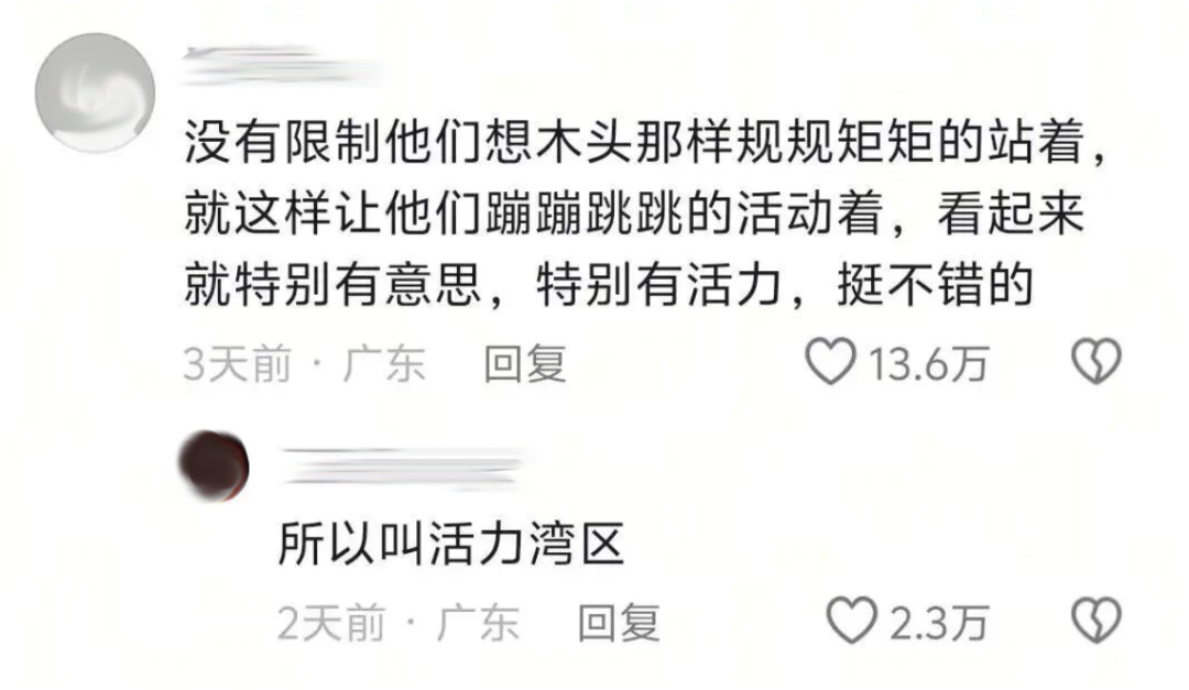 能穿着16斤玩偶服活动自如的确实不是普通人:开幕式上的大湾鸡“内胆”是来自广东武校的40名初中生,选拔时,特地考察了每个人的武术功底。“原本设计了武术动作,发现穿上玩偶服后无法实现。”负责人介绍,除了大场面动作是规定的,其他动作都是孩子们的自由发挥,“把活泼的天性展现出来”。网友看到即使是相对正式的仪式现场,每只大湾鸡都随着音乐节拍蹦蹦跳跳、舞姿自由发挥,感叹“没有限制他们规规矩矩地站着,所以看起来特别有活力。”