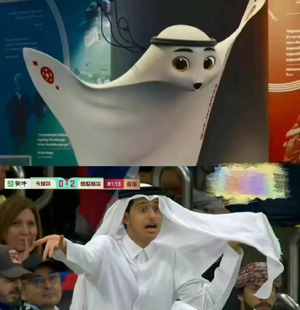 近几年在国内引起抢购热潮的吉祥物还有2022年的卡塔尔世界杯“馄饨皮”,学名拉伊卜(La'eeb),实际是块沙特土豪常戴的白色头巾,走红同样得益于关键人物和网友二创,因为观众席一位疑似中东王子的动作,和吉祥物撞了款,于是被网友拉郎配组cp,叠加“中东土豪”的浪漫幻想,饺子皮也成了炽手可热的IP文创。