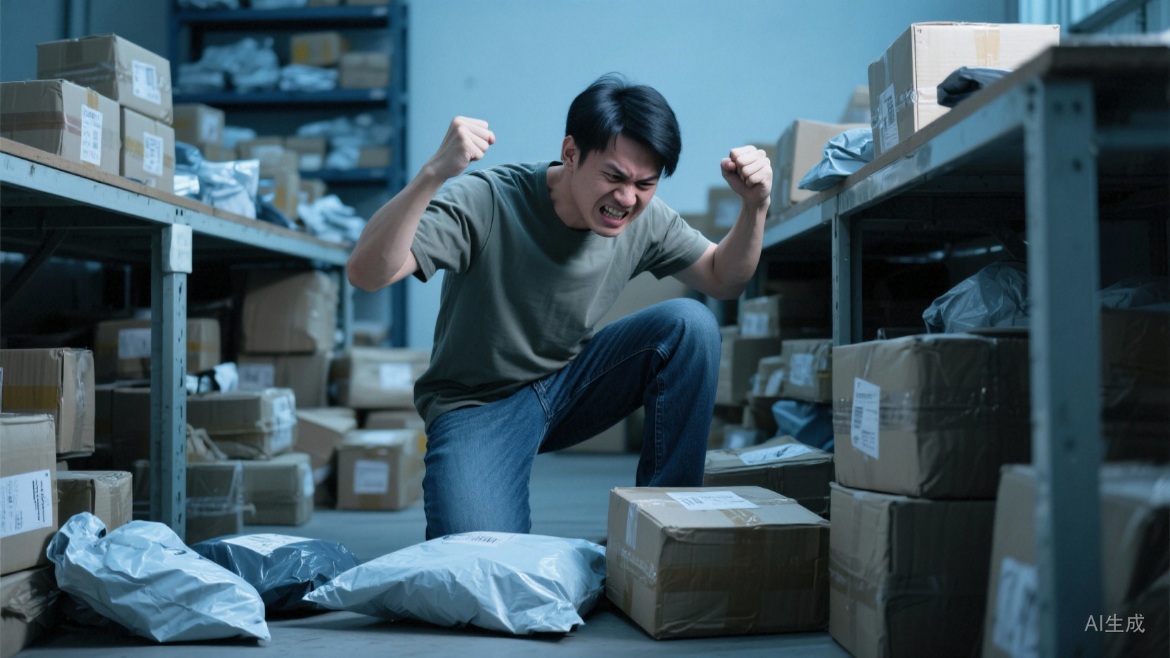 白天男人去仓库打包,女人在家里当客服,孩子在旁边写作业,夜里十一点,客服系统最后一条消息刚处理完,男的把最后一箱货交给快递小哥,关上灯,腰一折,蹲地上喘气。