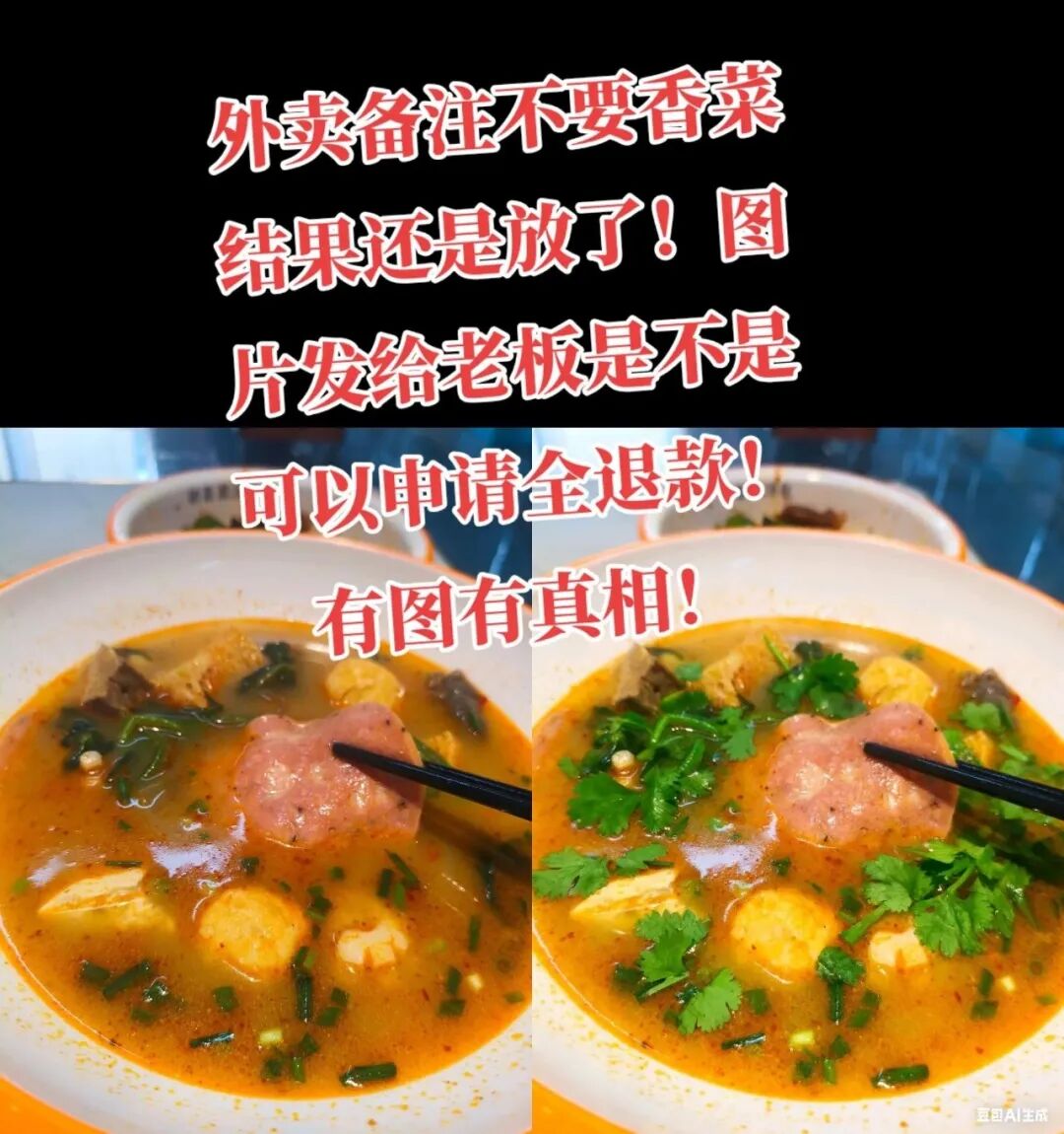 点外卖,备注不要香菜,老板记住了,没有放,外卖拿到手以后,用AI P了图,然后发给店家,说,你为什么给我放了香菜???退款!!!