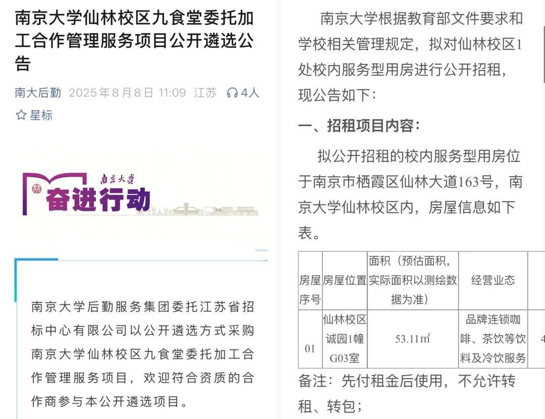 南大后勤的九食堂遴选公告和资产管理处的招租公告,后者为今年9月开业的茶百道