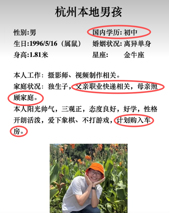 杭州本地男孩,初中学历,父亲搞快递,母亲没工作,本人离异单身,没房还没车。