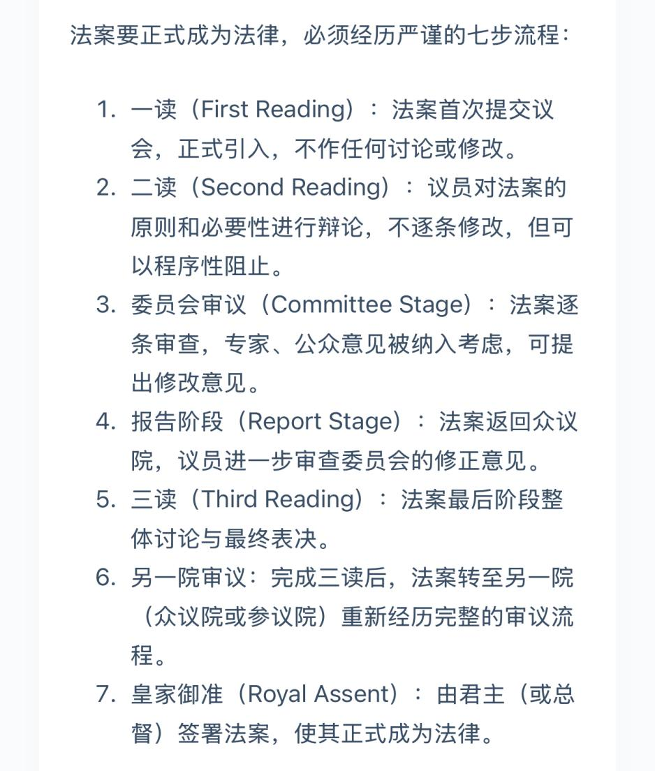 虽然一个法案的通过看上去是分为7步,但真正难的就是“二读”和“三读”,剩下几步都是跑程序,甚至第7步只是“作为英联邦成员国,由君主代表签字”,俗称“御赐恩准”这么个表面仪式。