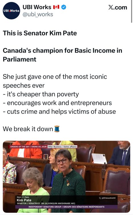 议员Kim Pate在参议院发表演说,详细解释UBI的实行,对于消除贫困、改善民众生活幸福指数,以及降低犯罪率都是很有正面作用的