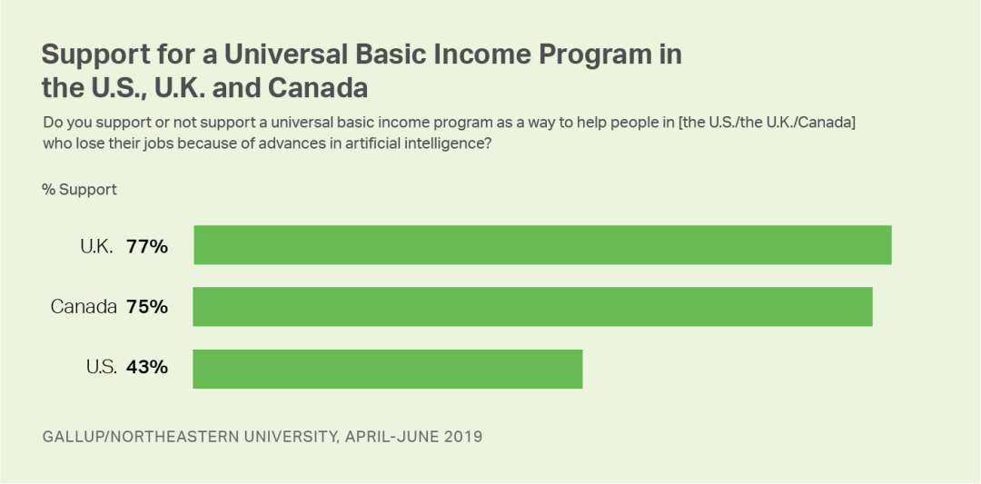 UBI这个话题在英国和加拿大是有超过75%的民众支持的,相反在美国却不怎么受欢迎