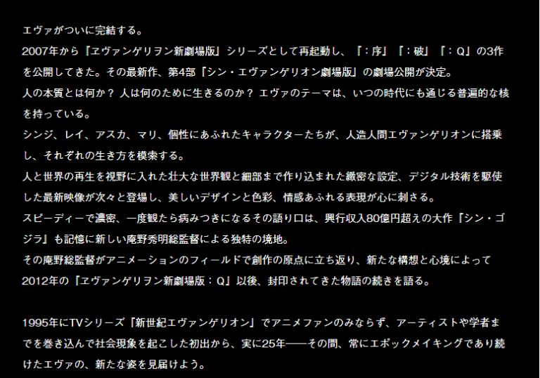 新EVA剧场版的官方网站的作品介绍中写着这样一段话:“人的本质是什么?人为何而生?EVA拥有着无论哪个时代都共通的内核。” EVA这部作品虽然属于机器人动画,但其所关注的从来都是“人”本身。
