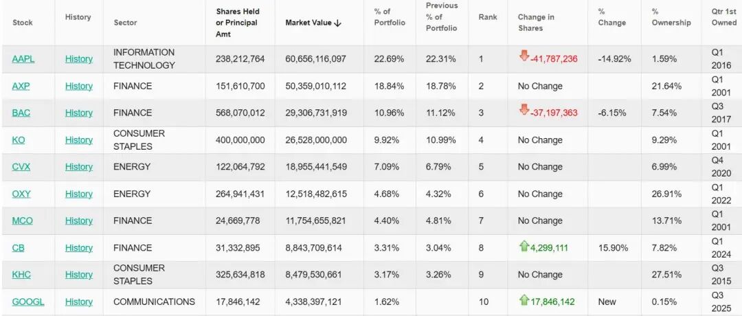 从持仓市值的变动看,苹果是三季度伯克希尔减持最多的个股。尽管如此,到三季度末,伯克希尔还持有苹果逾2.38亿股,苹果仍是头号重仓股。