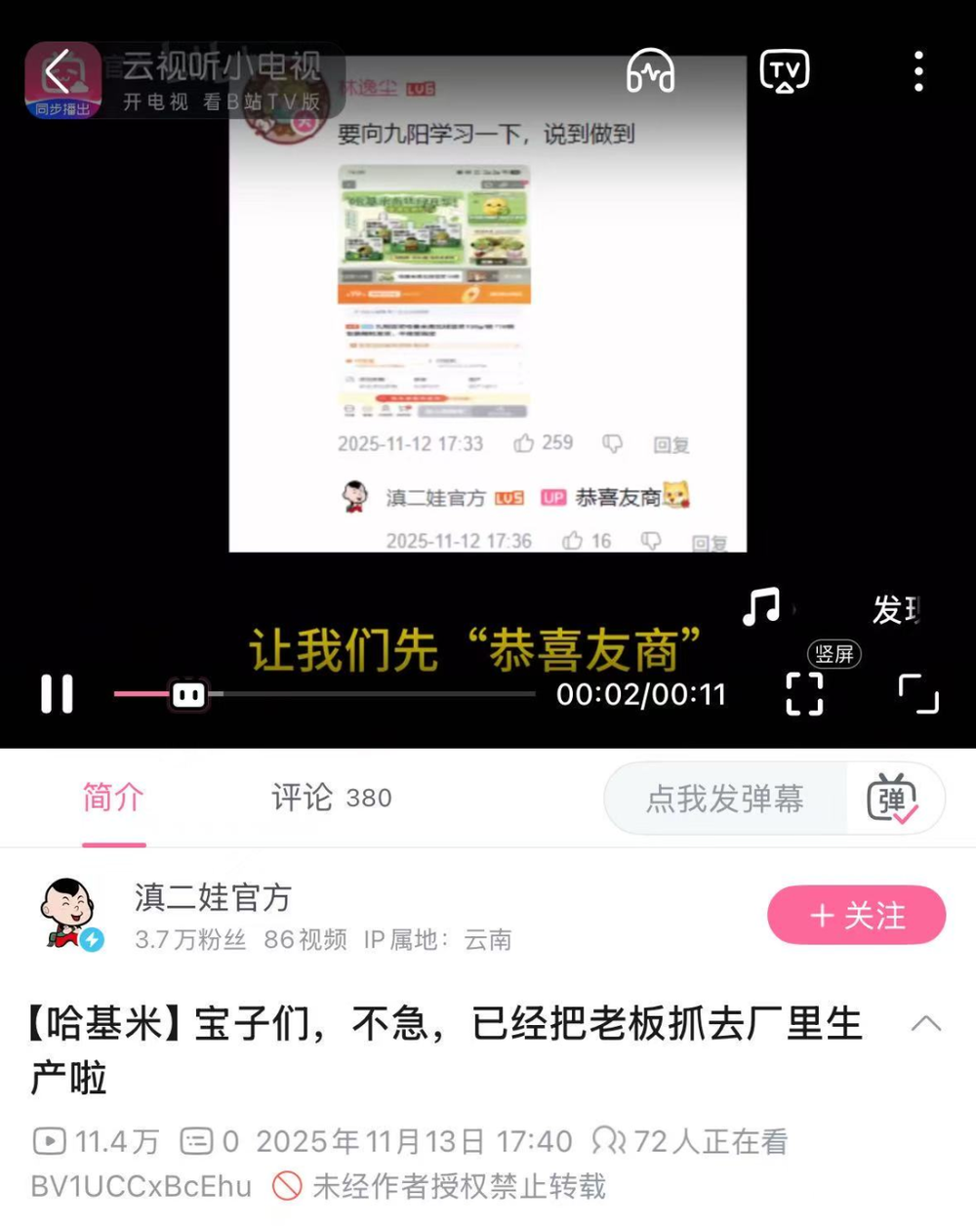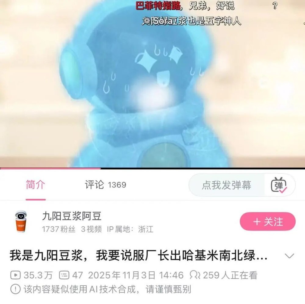 一个看着像九阳豆浆官方账号的UP主,发了一个题为“我是九阳豆浆,我要说服厂长出哈基米南北绿豆浆”的视频。