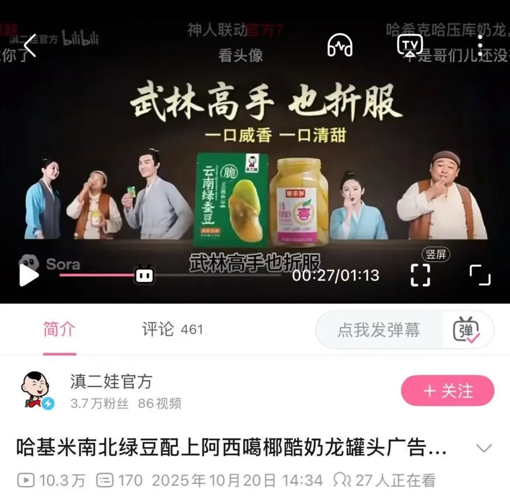 这还是只普通网友玩梗,但很快就有真的食品厂也加入了玩梗的行列,这次是云南零食品牌滇二娃玩了哈基米梗,虚构了相关食品广告并发在了B站上。