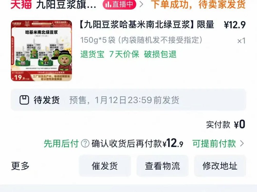 这销量是个什么概念呢?九阳豆浆今年上半年推出的“自律搭子”豆浆粉,上市首月卖了50万袋。这么一看,“哈基米南北绿豆浆”绝对算爆款了。