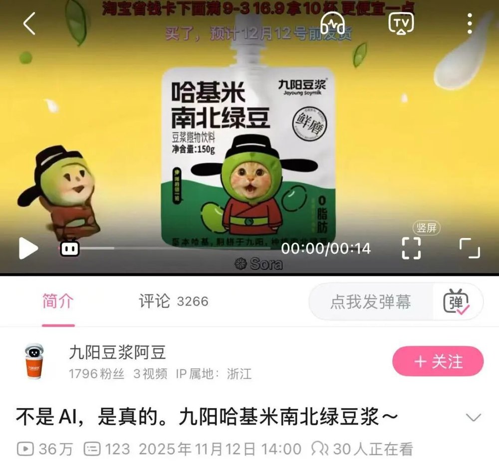 一开始,大家都认为只是九阳豆浆在整活,连这视频似乎都是AI生成的,很难让人相信真能推出一款“哈基米南北绿豆浆”。