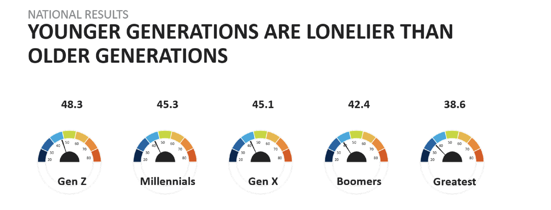 根据Cigna的一项调查,Z世代(18-22岁)的平均孤独感得分为48.3,在各个世代中排名第一,被称为“最孤独的一代”。报告也指出,各世代的孤独得分随年龄下降而逐渐升高。
