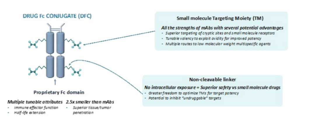 这种形式被定义为DFC药物。不过,DFC的作用机制与ADC等药物并不相同——DFC旨在结合细胞外靶标,而ADC的核心是进入靶细胞后递送并释放细胞毒性小分子药物。相较于ADC和单克隆抗体,DFC分子更小,具备更优的组织渗透潜力,且设计目标是靶向多个作用位点。