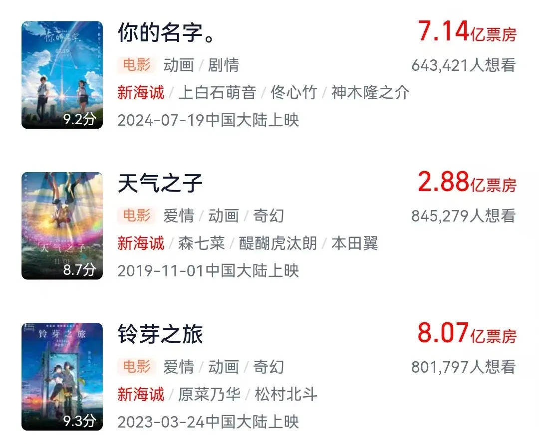 比如入坑新海诚的最佳时机是《你的名字。》。它得以引进后,新海诚的新作就普遍能够获得高关注与高票房。