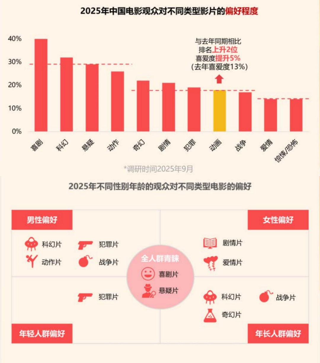 动画电影在内容层面,也会有喜剧、动作、奇幻、爱情等类型上的区别。因此,即便动画片今年佳作颇多,在“2025年中国电影观众对不同类型影片的偏好程度”的统计里,也只是列在第八位。