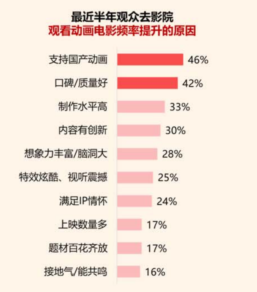 今年观众观看动画电影频次提升的原因中,“支持国产动画”竟然以46%高居榜首。这种情怀驱动的观影动力,往往有一个红利周期。未来国产动画想继续吸引观众进场,不能总想打这张牌。