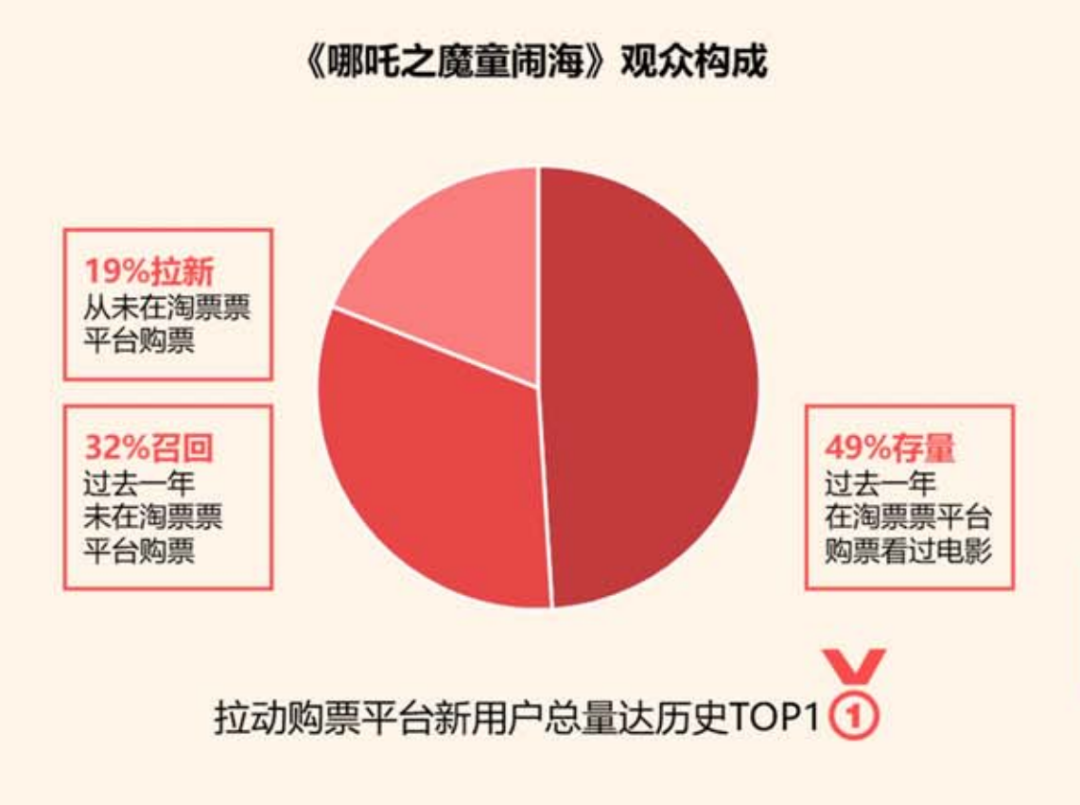《哪吒之魔童闹海》的观众里,有19%属于拉新(从未在淘票票购票),有32%属于召回(过去一年未在淘票票购票)。