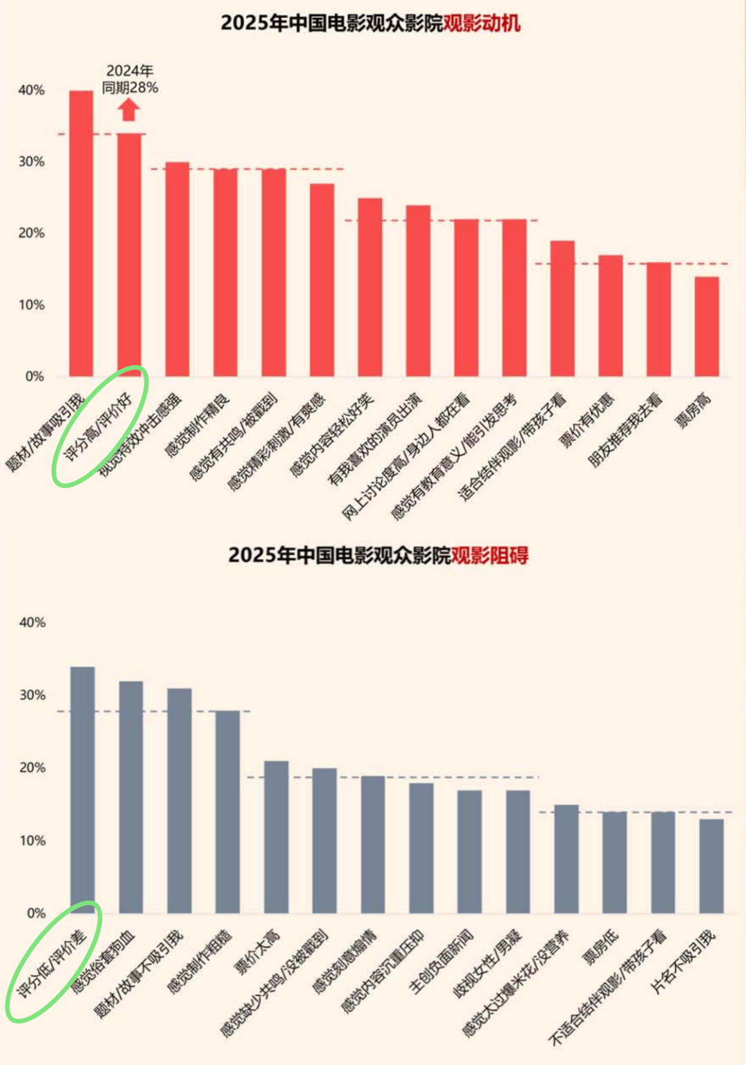 在“2025年中国电影观众影院观影动机”统计中,“评分高/评价好”高居第二。而在“2025年中国电影观众影院观影阻碍”中,“评分低/评价差”排到了第一位。