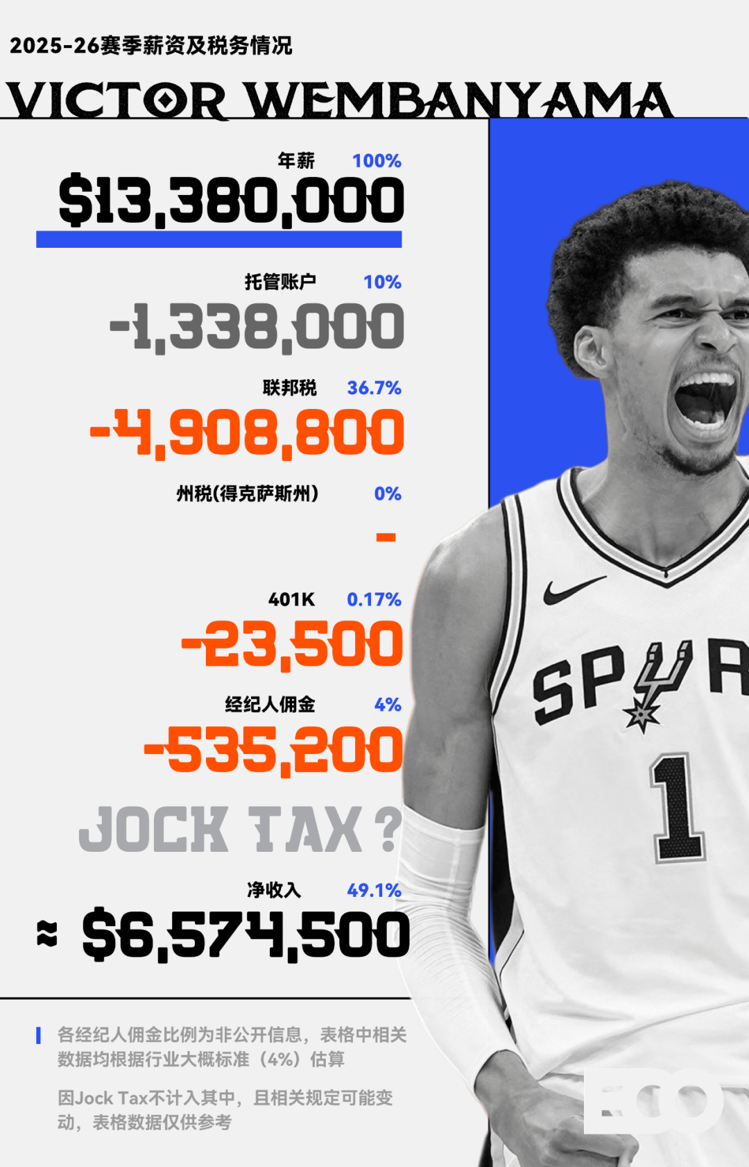 以杨瀚森为例——他在2025-26赛季的年薪为442万美元(约3100万人民币),仅联邦税一项,就要缴纳约159.2万美元,占总薪资的36%。