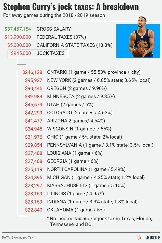 简单来说,每到一座不同的城市打客场,球员都就会被记上一笔“Jock Tax”,这意味着NBA球员在打完一个赛季后,必须要向十几个州分别申报、缴税。