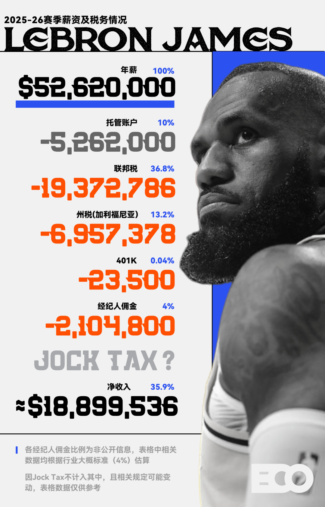 对球员而言,工资帽决定了最多能拿到多少钱,但真正能装进口袋的收入,却远没有账面数字那么简单。当工资从联盟拨付到个人账户的那一刻起,一整套复杂的财富分配体系也随之启动,而其中的第一道,也是最大一道切口,来自税。