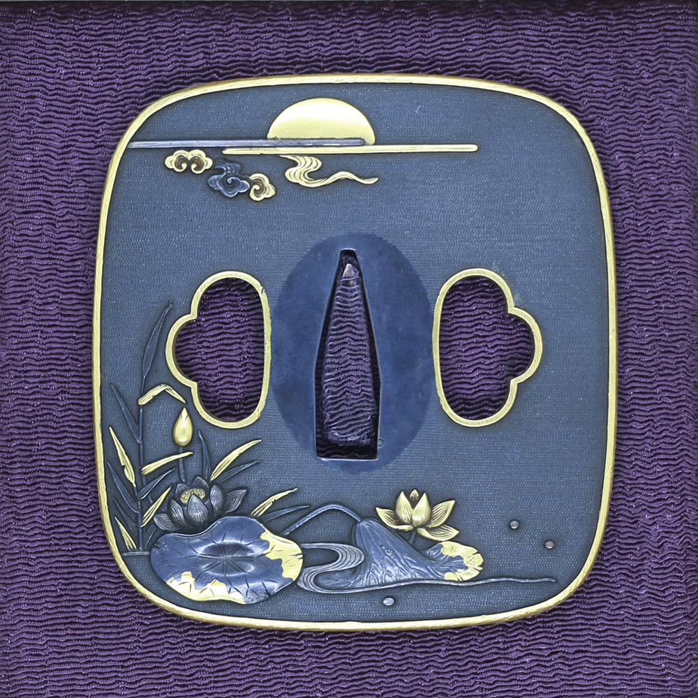 魚子地赤銅鐔 蓮と白鷺