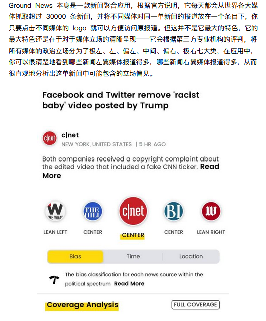 那么有没有相对平衡的处理办法呢?确实也有。美国的Ground News项目就是一个有趣的例子。它与其说是新闻,倒不如说是新闻聚合网站。通过对所有新闻网站进行归类,它标记处不同意识形态媒体优先报道了哪些问题,从而展现出意识形态对媒体报道偏好的影响。或者更准确地说,这种媒体处理方式正在从实质性中立退缩回程序性中立。