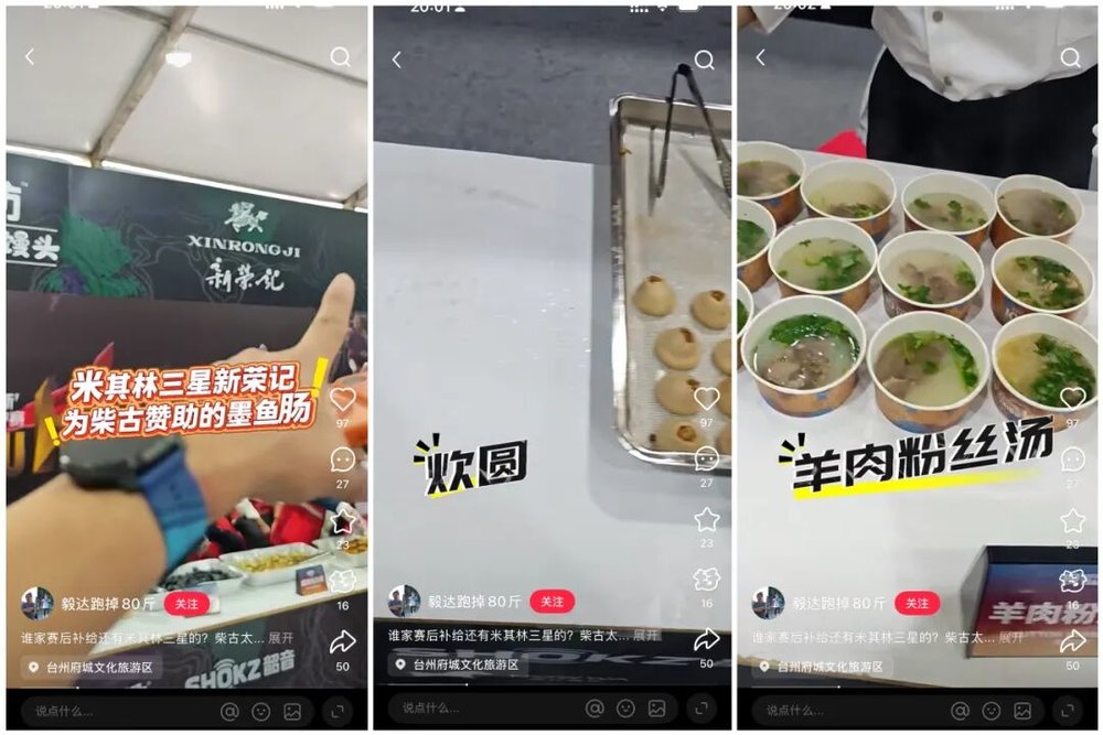 月初结束的柴古唐斯越野赛,被越野跑爱好者盛赞为“补给天花板”、“大型自助餐”,除了常规的面条、馒头、糕点等快速补充碳水的食物,赛后的临海特色美食区还出现了米其林三星“新荣记”,跑者不仅跑爽了,还能吃爽了。