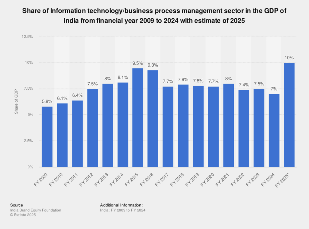 过去的30年,IT产业为印度平均贡献了高达7%的GDP(尽管其雇佣人口仅占全国劳动力的1%),是名副其实的印度经济“引擎”。